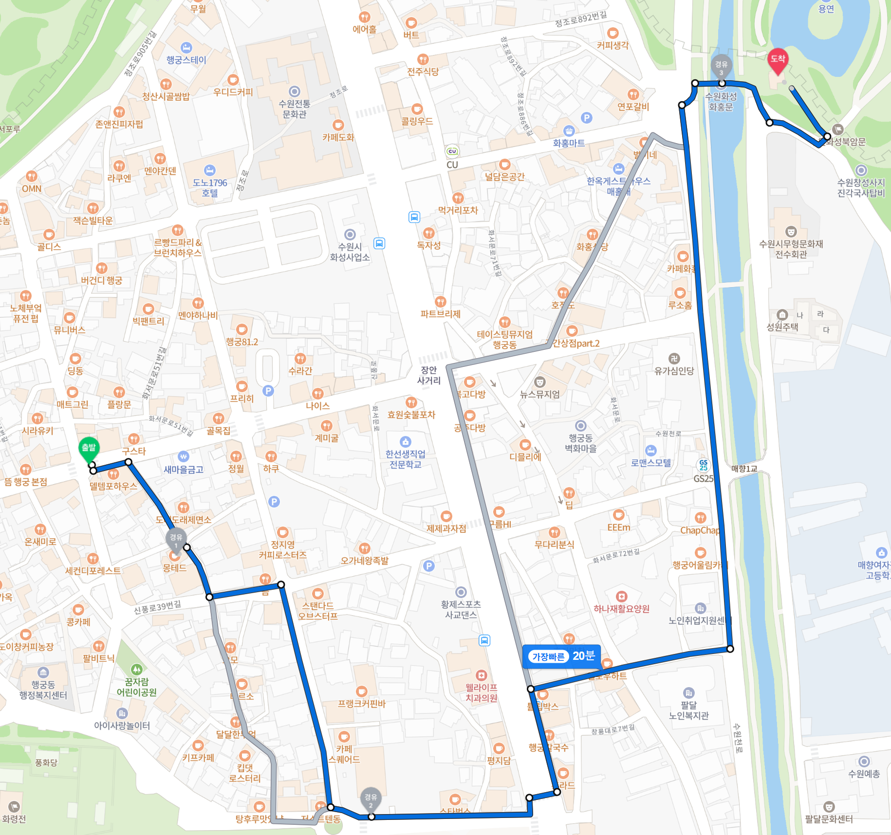드라마 촬영지는 1코스에서 확인할 수 있으며, 카페 몽테드와도 인접한 골목입니다. 골목을 따라 걷다 보면 정조가 실제로 행차했던 길과 백성들과 이야기를 나눴던 장소, 수원화성의 축조 과정을 자세히 살피기 위해 올랐던 언덕 등 정조와 관련된 다양한 역사적 장면을 상상할 수 있습니다.