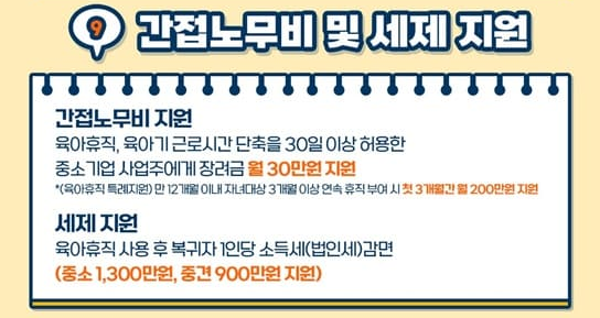 - 세제 지원: 육아휴직 사용 후 복귀자 1인당 소득세(법인세)를 중소기업은 1,300만원, 중견기업은 900만원 감면합니다.
