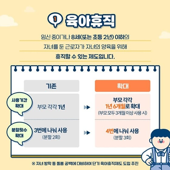 - 사용기간 확대: 기존에는 부모 각각 1년이었으나, 이제는 부모 각각 1년 6개월로 확대되었습니다. 부모 모두 3개월 이상 사용 시 적용됩니다.