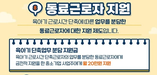 - 육아기 단축업무 분담 지원금: 육아기 근로시간 단축근로자의 업무를 분담한 동료근로자에게 금전적 지원을 한 중소기업 사업주에게 월 20만원을 지원합니다.
